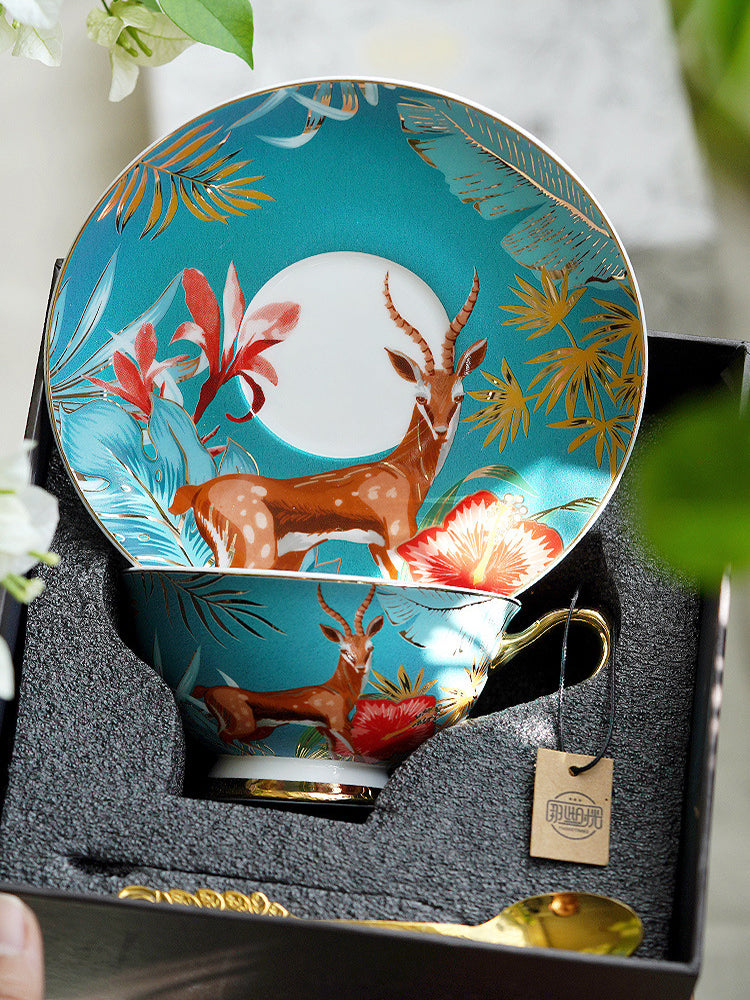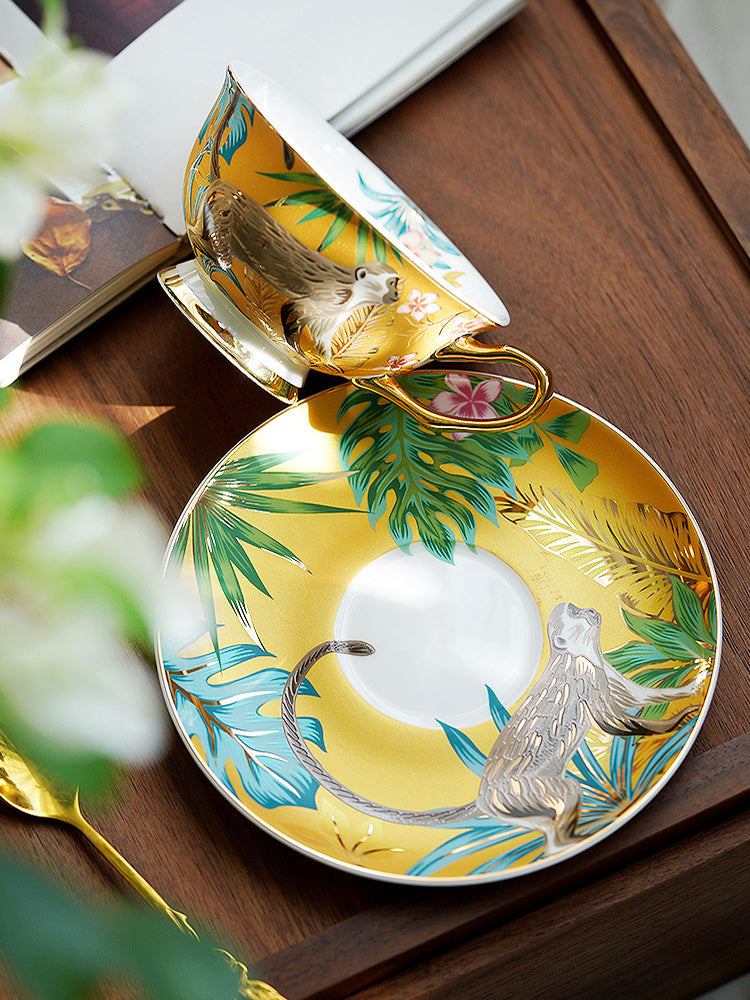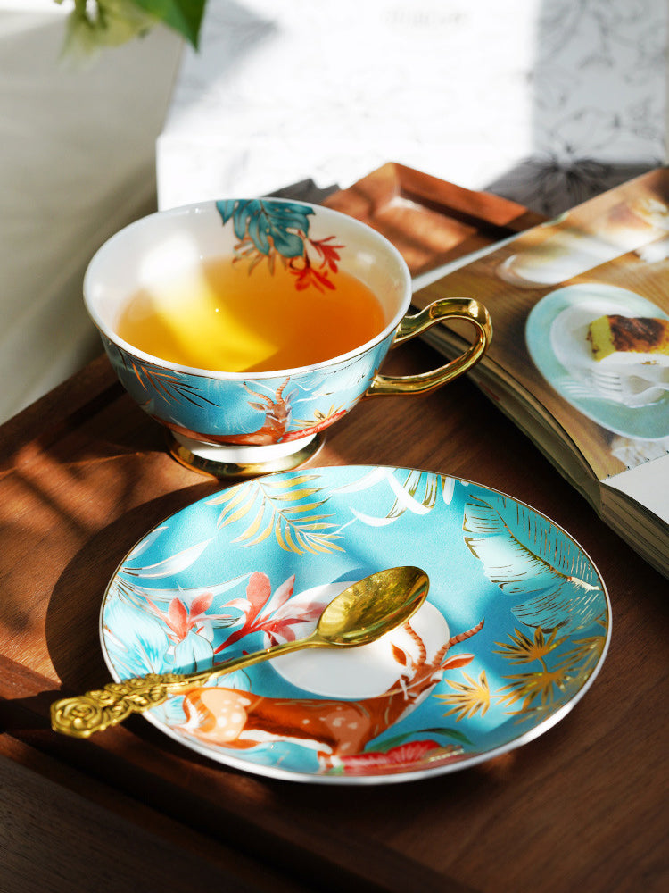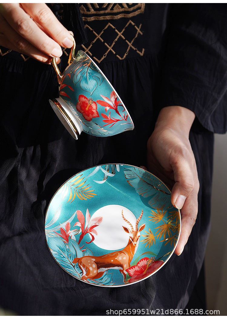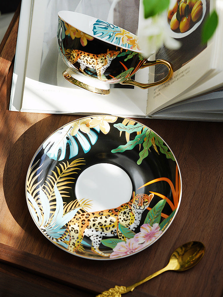 Immerse your daily tea or coffee ritual in the lush energy of the tropics with our "Salt-Style Rainforest" Bone China Set. The surface features vivid depictions of flowers, plants, birds, and animals—each element complementing the other to create a lively scene.