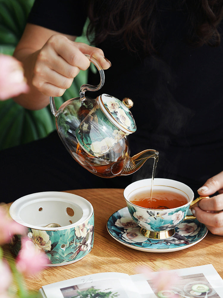 Elegant camellias and lively little birds come together in this exquisite set. The soft, glazed surface plays with light and shadow, enhancing the brilliant florals and creating a harmonious visual feast that amazes your tea time. The tall, arched handle is not only elegantly streamlined but also provides a secure and comfortable grip. The creative floral and bird pattern is full of vitality, radiating a rich classical Chinese aesthetic.