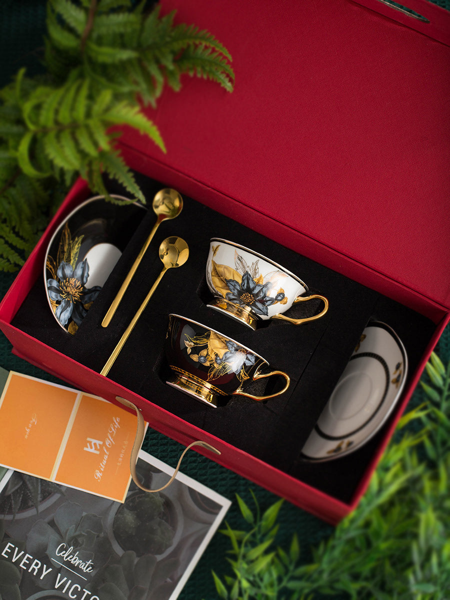 Vintage Luxury Bone China Coffee Mug & Saucer Set, Elegant Ceramic Couple Cups with Gold Trim, Gift Box for Afternoon Tea, Retro Wedding & Housewarming Present